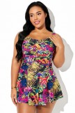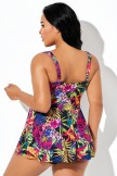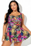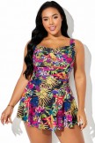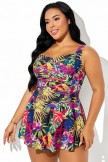 Belly Ruched Ruffle Hem Tropical Print Swimdress