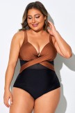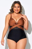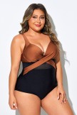 Traje de baño de una pieza con aros y malla recortada en negro y marrón rojizo