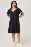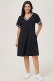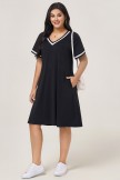 Vestido midi negro con escote en V, ribete blanco y bolsillos