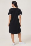 • Este vestido negro presenta un escote en V con rayas blancas en el escote. Las mangas cortas también tienen rayas blancas en los puños y bolsillos a ambos lados. El corte general es holgado, creando un estilo sencillo, elegante y práctico.