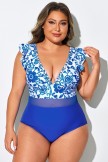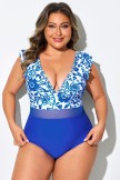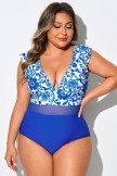 Traje de baño de una pieza con escote en V pronunciado y volantes florales azules