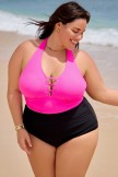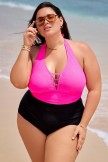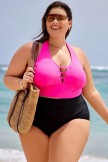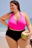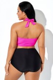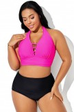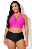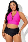 Top de bikini con cuello en V profundo y halter rosa brillante