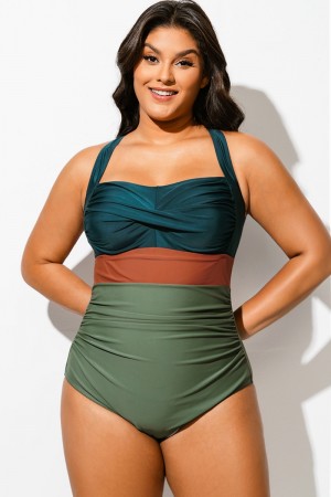 Traje De Baño De Una Pieza Ajustado Con Frente Torcido En Contraste Amarillo Y Verde De Talla Grande41,99 €