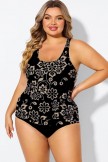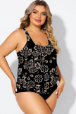 Top tankini tipo blusón con espalda cruzada y estampado floral dorado