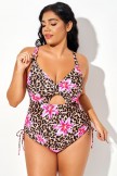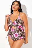 Traje de baño de una pieza con estampado de leopardo y flores, con tirantes cruzados y cordón ajustable en la espalda.