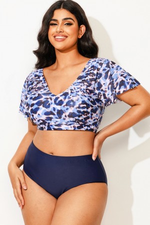 Top de Bikini V-cuello con Manga de Aleteo y Floral Estampado