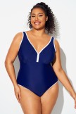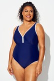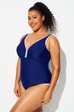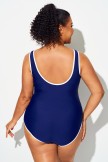 Traje De Baño De Una Pieza Elegante Con Cuello En V En Azul Oscuro De Talla Grande