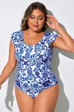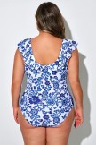 Traje de baño de una pieza con ribete de volantes fruncidos en azul porcelana