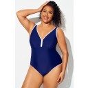 Traje De Baño De Una Pieza Elegante Con Cuello En V En Azul Oscuro De Talla Grande