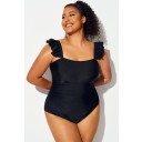 Traje De Baño De Una Pieza Con Volantes Negros Liso De Talla Grande