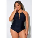Traje de baño de una pieza con cuello halter calado en color negro liso