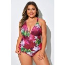 Traje de baño de una pieza con palmeras tropicales color vino oscuro