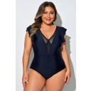 Traje de baño enterizo cruzado de malla negra con ribete de volantes