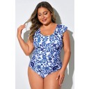 Traje de baño de una pieza con ribete de volantes fruncidos en azul porcelana