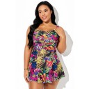Belly Ruched Ruffle Hem Tropical Print Swimdress