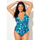 Traje de baño de una pieza con escote en V y estampado floral tropical azul
