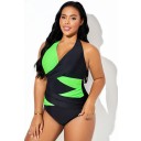 Traje de baño de una pieza elegante con escote halter en negro y verde fluorescente