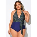 Traje de baño de una pieza con escote halter y efecto cruzado a rayas verdes y azules