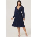 Vestido Azul Marino V-cuello Estilo Jersey de Manga Larga con Nudo Frontal