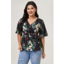 Top V-cuello Malla Volantes con Floral Estampado