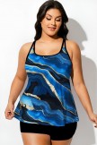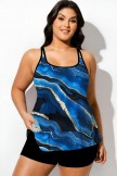 Top de tankini con cuello redondo, estampado azul y detalles dorados jaspeados
