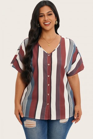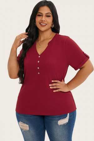 REBAJACamiseta de manga corta con botones y cuello en V burdeos