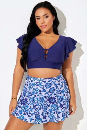 REBAJATop de Bikini Azul V-cuello Lazo con Flores Estampado