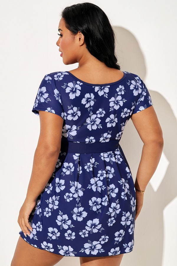 -37%Top De Bikini Corto Anudado Con Estampado Floral Azul Y Naranja De Talla Grande