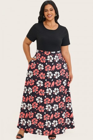 REBAJAVestido Maxi Negro V-cuello de Manga Corta con Floral Estampado